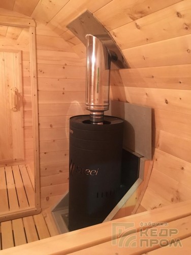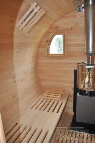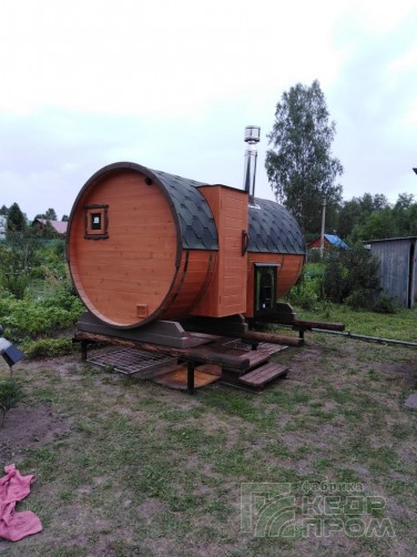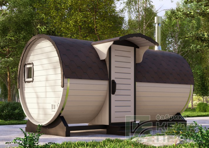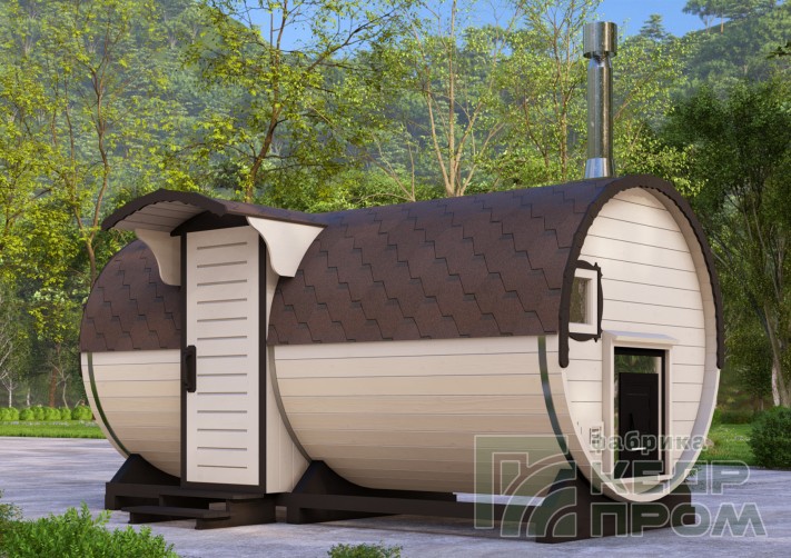 Круглая баня-бочка длиной 4,5 метра с входом сбоку. Данная модель бани будет удобна в первую очередь расположением и планировки и застройки участка таким образом, что вход возможен только с передней стороны фасада. А также внутреннее пространство может показаться более удобным и комфортным в сравнении с классическим входом с торца.