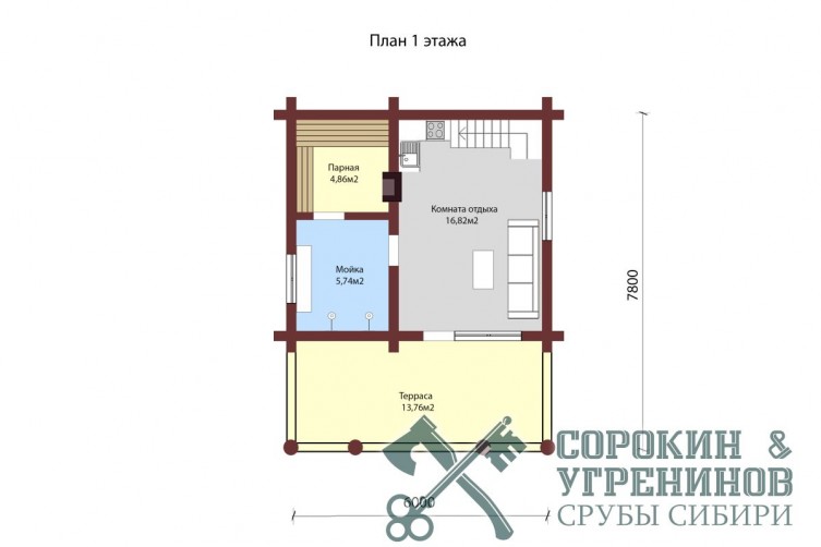 Рубленая баня из лафета кедра, общей площадью 72,16м2, со вторым мансардным этажом. Размер сруба 6х7,8 метров по осям. Планировка бани, парная и мойка раздельные, комната отдыха, терраса на первом этаже. Лестница на второй этаж, где спальня с балконом. Сруб рубленый в норвежский замок. Объем лафета в срубе 50м3.